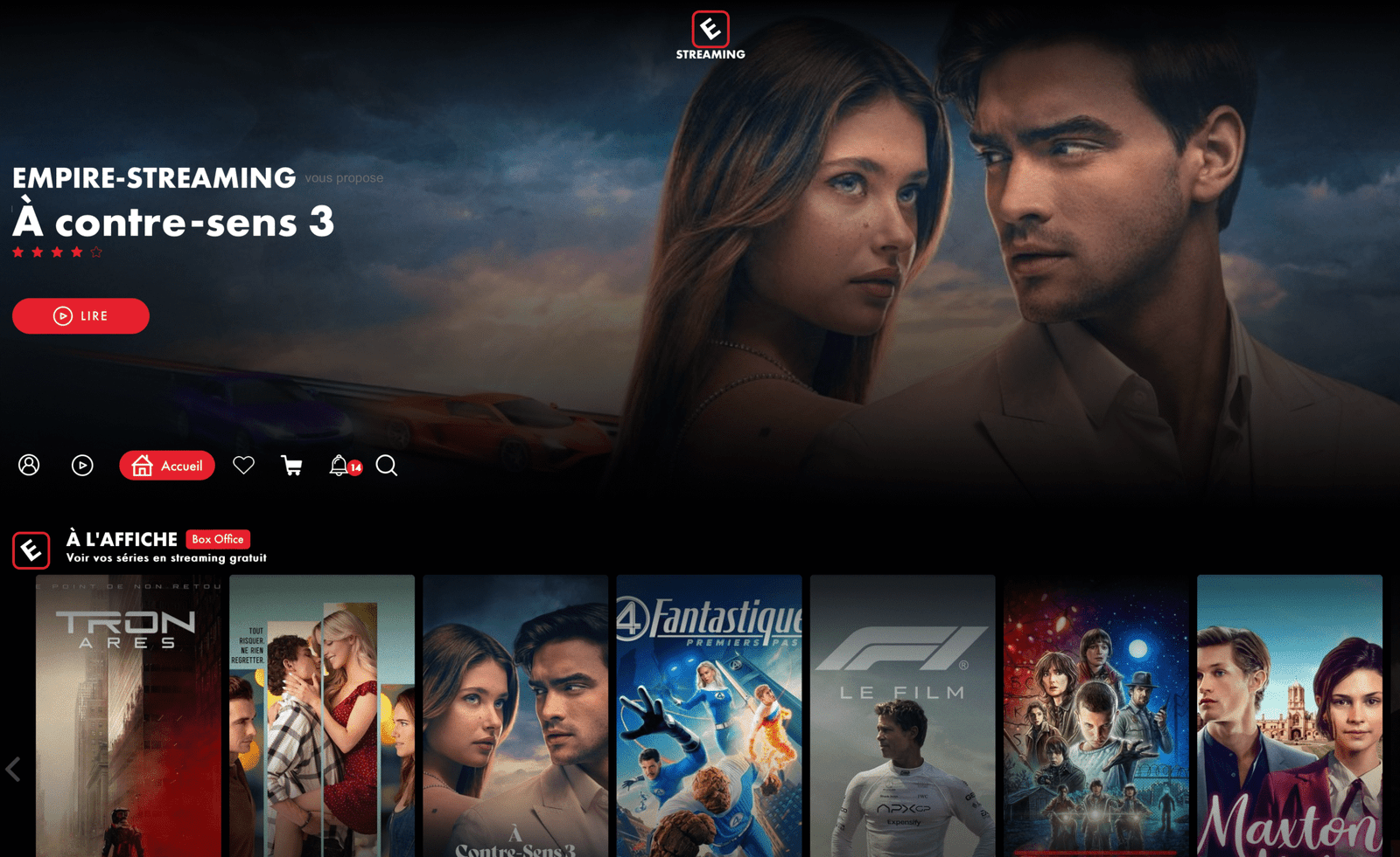 Empire Streaming est une plateforme SVOD dont la spécialité reste la diffusion d’œuvres cinématographiques. Très visité, le service propose du streaming gratuit et illimité, avec des films et séries disponibles immédiatement sur la page d’accueil. En tant que visiteur, vous allez pouvoir visionner des films, des séries télévisées, mais aussi des documentaires, des spectacles, des films d’animation et des dessins-animés.